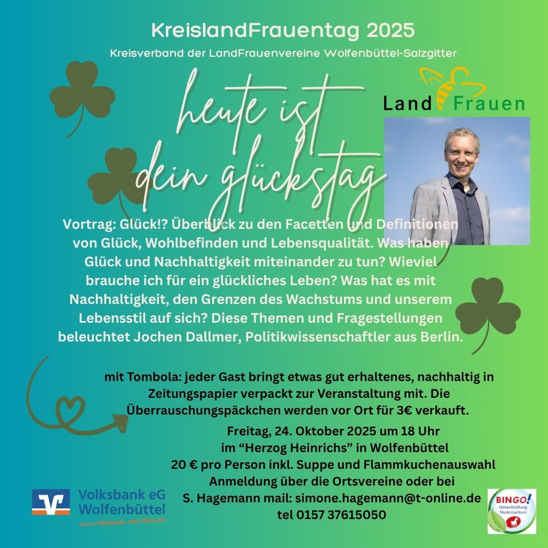 Info & Anmeldung: Bildungsstätte Bredbeck. (Wird erneut angeboten am 6.-10.Juli 2026!) - Vortrag „Glück und Nachhaltigkeit“ beim KreislandFrauentag Wolfenbüttel-Salzgitter, 24. Oktober 2025. Im Rahmen des Projektes Zukunft im Blick vom Niedersächsischen LandFrauenverband. Einladung/Flyer.